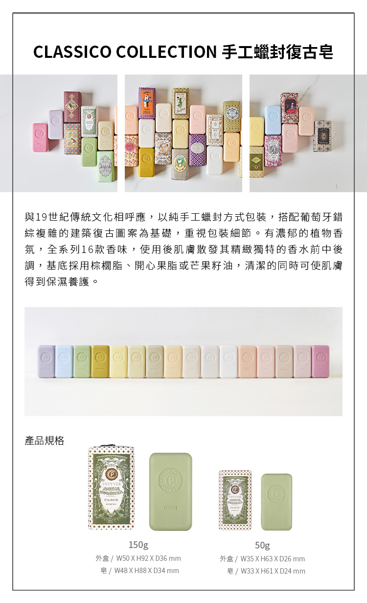1887年創立的葡萄牙百年皇室香皂,延續自19世紀末和20世紀初的新藝術和裝飾藝術風格,加上純手工以黏封方式包裝,為生活細節更添細膩質感和品味。不添加額外的人工固香成份。(規格:50g)