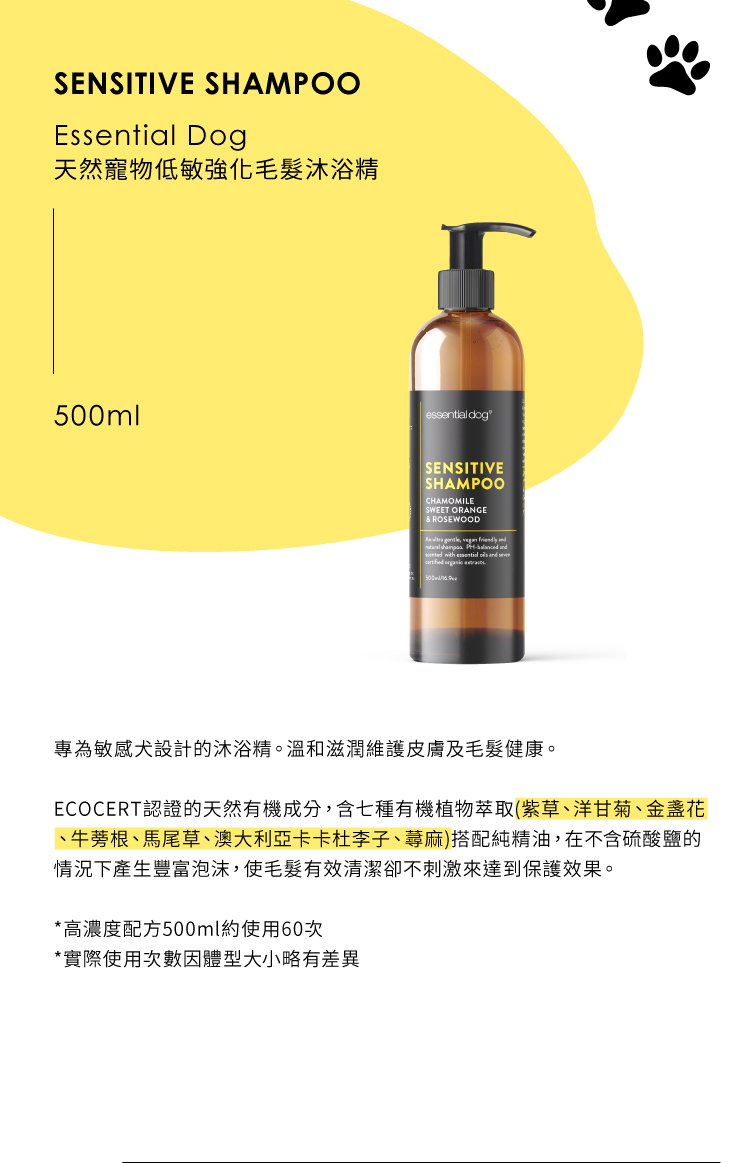 【惜福商品】Essential Dog 天然寵物低敏強化毛髮沐浴精 500ml (有效期限:2024/10)