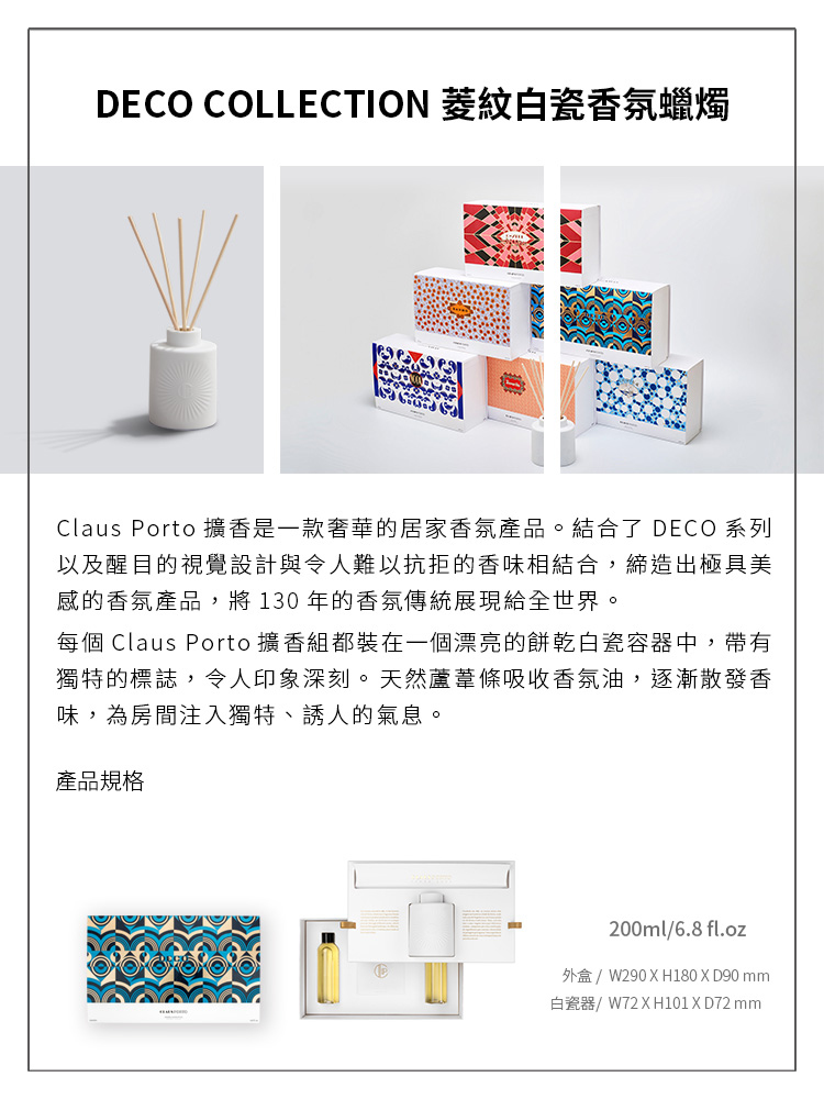 Claus Porto Deco系列擴香組是家居香水的終極奢侈品。以令人陶醉的氣味打造出令人目眩神迷的視覺效果,創造出極具質感的香氛空間,吸取了藝術和香水130年傳統的精隨。