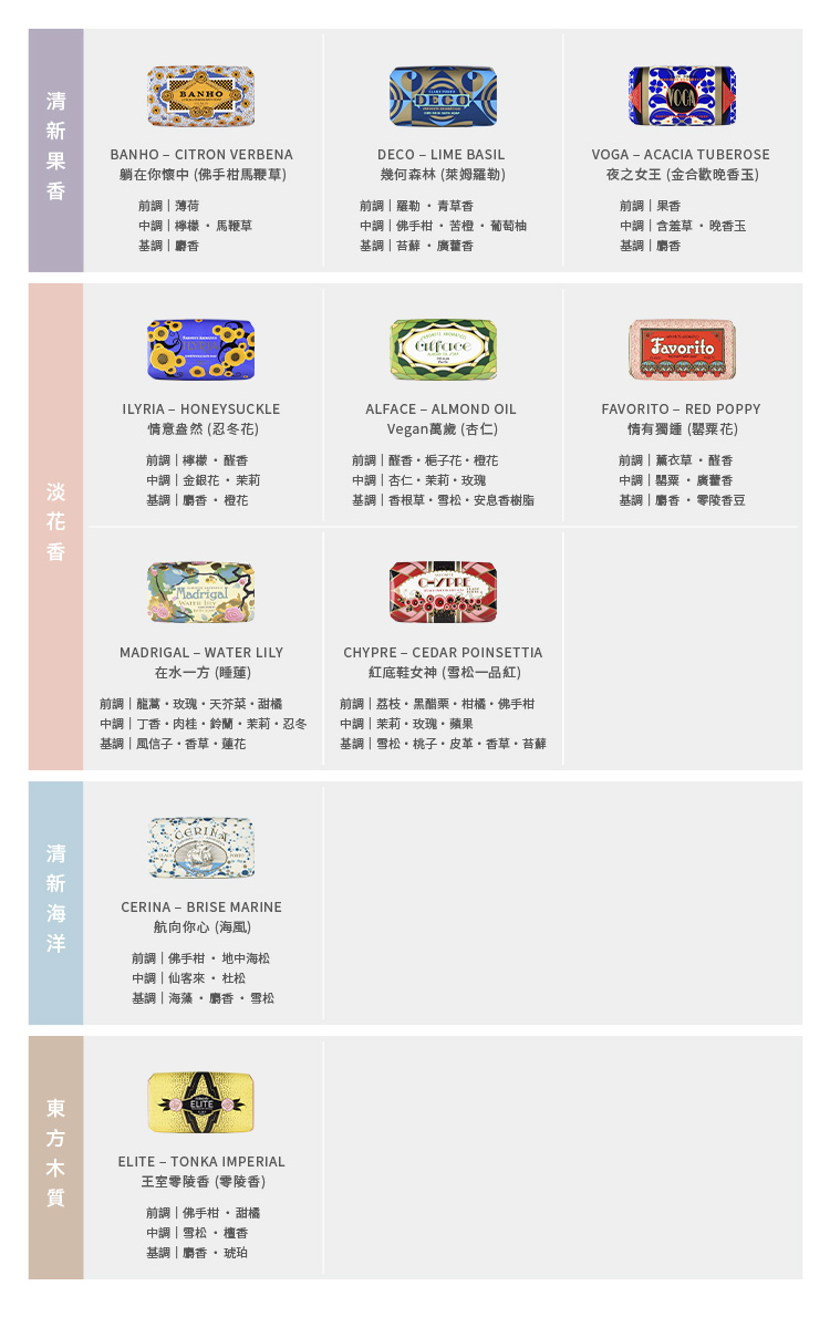 乳油木果油、棕櫚脂、植物香氛。前調:醛香、梔子花、橙花;中調:杏仁、茉莉和玫瑰;基調:維提味香草、雪松和安息香樹脂。