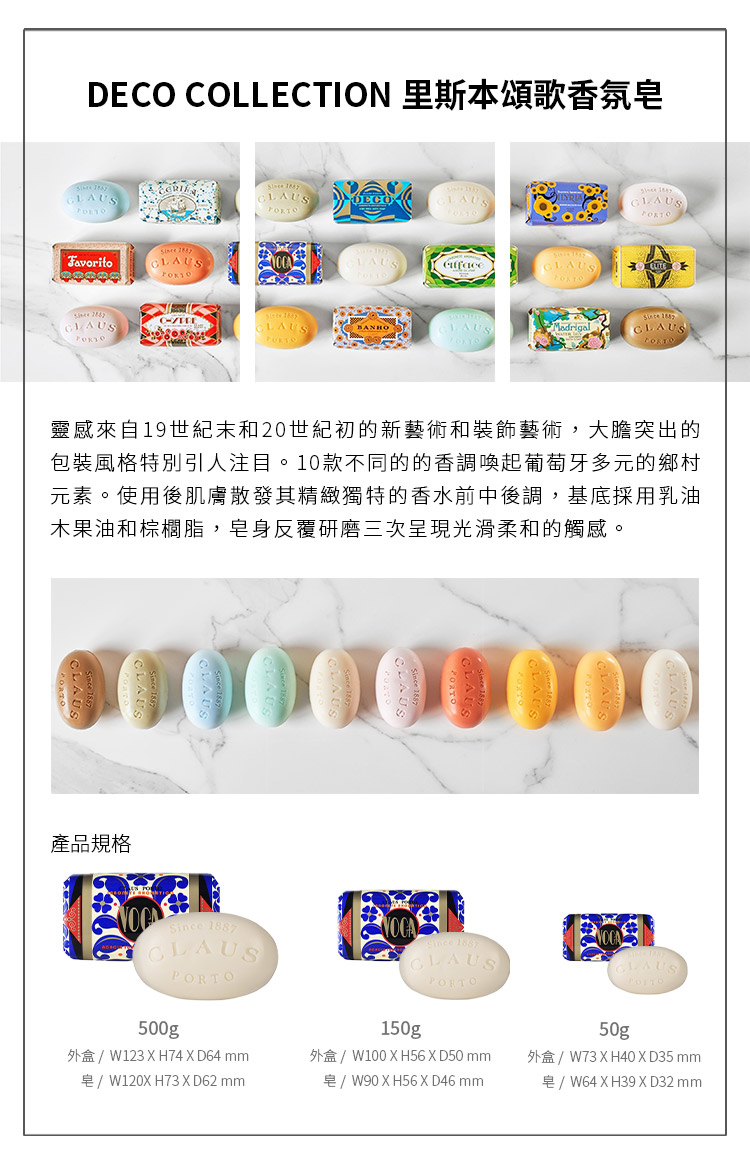 1887年創立的葡萄牙百年皇室香皂,延續自19世紀末和20世紀初的新藝術和裝飾藝術風格,加上純手工以黏封方式包裝,為生活細節更添細膩質感和品味。這款100%植物皂與乳油木果油混合,反覆研磨三次呈現光滑柔和的觸感。香味屬性為清新香調,增強了檸檬和馬鞭草的清新檸檬香氣。再與麝香相結合,為飄逸的香水增添了深度,非常適合旅行。不添加額外的人工固香成份。(規格:50g)