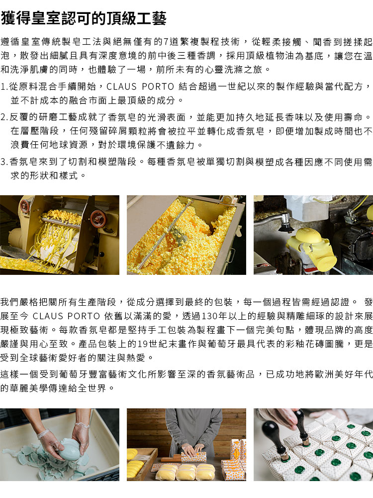 至今仍遵循著舊世界工藝繁複的7道製作工序,讓天然植物香氛與多種高純度植物油脂滋潤肌膚,在反覆多次攪拌,多層壓製成扎實質感,並經長時間自然乾燥,讓氣味持久溫和飄散,泡沫更豐富細緻。